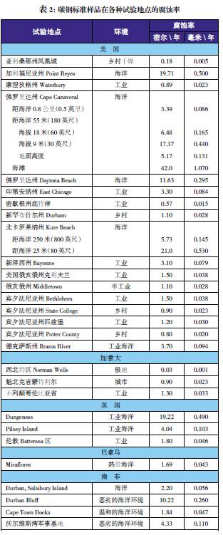 世界各地都進(jìn)行過各種應(yīng)用環(huán)境下的金屬腐蝕性能比較試驗(yàn)。以碳鋼為標(biāo)準(zhǔn)樣品對這些試驗(yàn)地點(diǎn)的腐蝕性進(jìn)行了比較。表2給出了標(biāo)準(zhǔn)樣品在北美試驗(yàn)地點(diǎn)的腐蝕率數(shù)據(jù)。盡管某些地點(diǎn)處于經(jīng)常使用除冰鹽的地區(qū),但樣品并未暴露于除冰鹽之下。