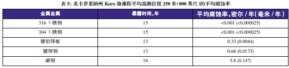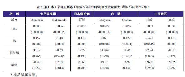 表3至表6的數(shù)據(jù)來自于日本、巴拿馬、Kure 海灘(北卡萊羅納州)和南非的試驗(yàn)地點(diǎn)。可利用這些數(shù)據(jù)在類似環(huán)境中選擇適當(dāng)?shù)慕饘俨牧希M(jìn)行生命周期成本分析。